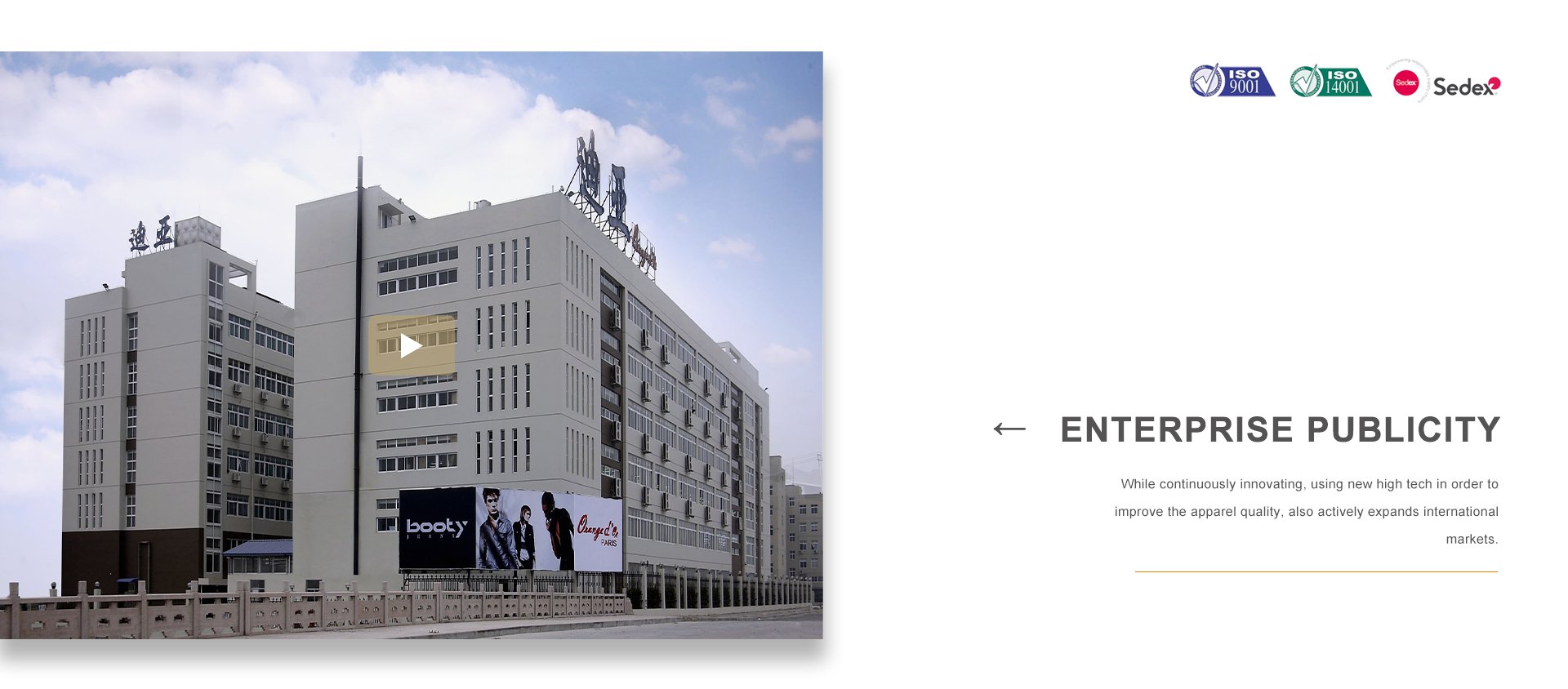 浙江迪亞服飾有限公司于1998年在世界時尚品牌之都——法國巴黎二區(qū)應運而生。同年,在浙江省甌海經濟開發(fā)區(qū)東方南路28號設立服裝制造工廠。公司集服裝設計、生產、營銷、品牌于一體,在不斷創(chuàng)新、采用高新技術提高服飾質量的同時,積極拓展國際市場,海外營銷部長期與LV集團旗下的MAJE、SOEUR、BALIBARIS等國際著名品牌保持非常緊密的合作關系。